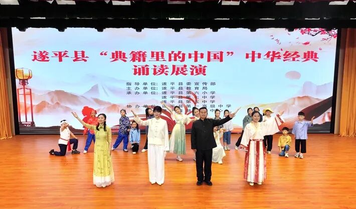 为深入贯彻落实党的二十大精神,传承弘扬中华优秀传统文化,增强广大师生爱党爱国情怀,根据县委宣传部2025年“新时代 新征程 新风貌”十大群众文化活动部署,5月15日,遂平县成功举办“典籍里的中国”中华经典诵读展演活动。参演选手以声传情、以诵达意,在经典诵读中探寻文化根脉,展现新时代新风貌 。