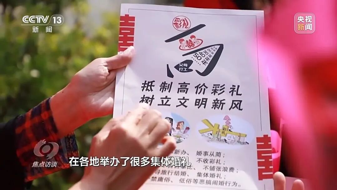 共青团中央宣传部副部长 刘钊:我们在进行社会倡导,进行文明引导,在各地举办了很多集体婚礼,确实得到了基层青年比较热烈比较积极的响应。他们用更朴素更自然更贴近自己实际需求的方式方法来筹办自己的婚礼,也来回应一些高额彩礼给他们所带来的压力,我们觉得这是一种非常好的导向。