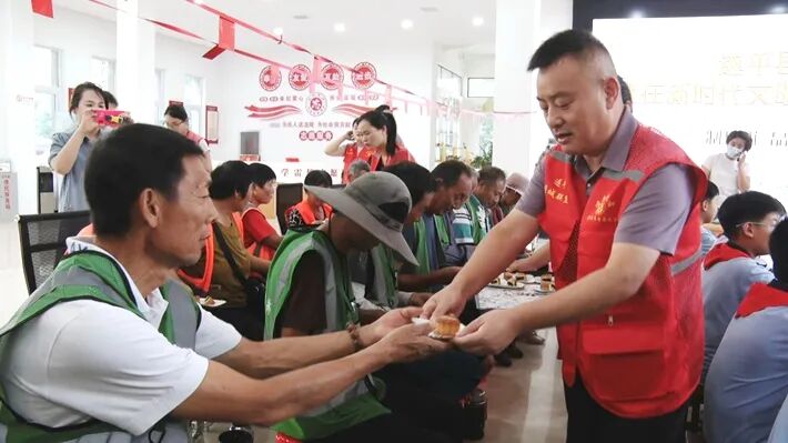在新时代文明实践中心,志愿者们精心制作了各种口味的月饼,并逐一分发给环卫、园林、电力等一线员工代表品尝,共同感受团聚的温馨和幸福。
