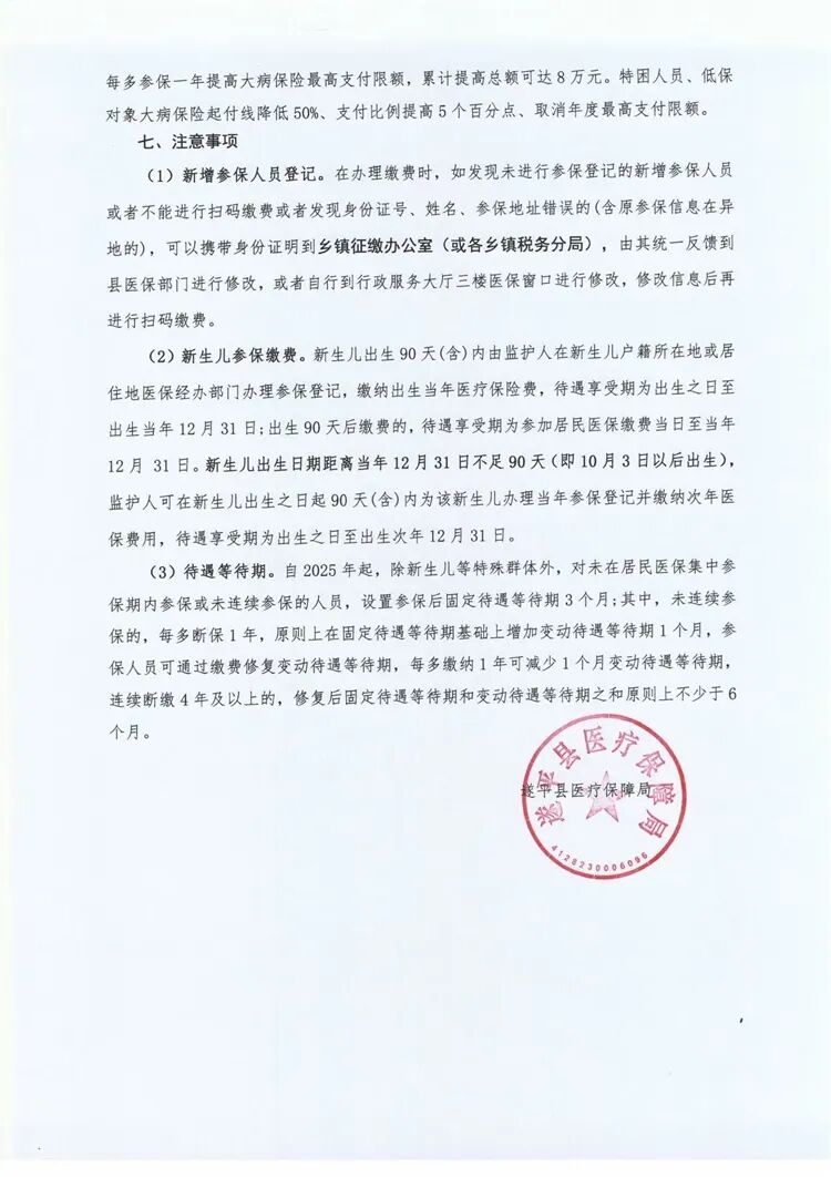 (3)待遇等待期。自2025年起,除新生儿等特殊群体外,对未在居民医保集中参保期内参保或未连续参保的人员,设置参保后固定待遇等待期3个月;其中,未连续参保的,每多断保1年,原则上在固定待遇等待期基础上增加变动待遇等待期1个月,参保人员可通过缴费修复变动待遇等待期,每多缴纳1年可减少1个月变动待遇等待期,连续断缴4年及以上的,修复后固定待遇等待期和变动待遇等待期之和原则上不少于6个月。