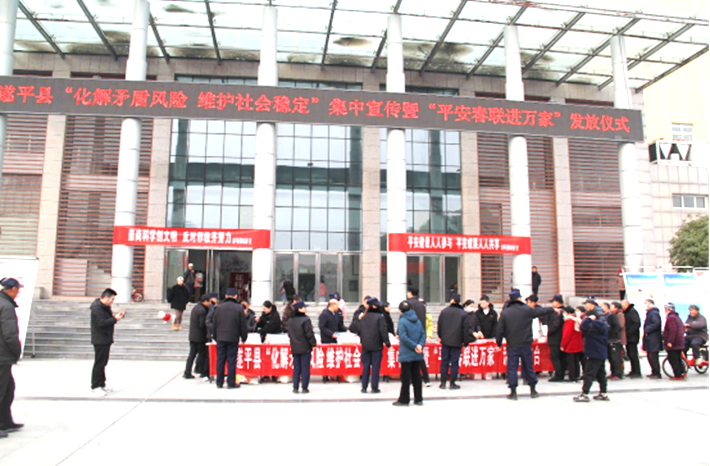 1月22日下午,遂平县“化解矛盾风险 维护社会稳定”集中宣传暨“平安春联进万家”活动在县文化艺术中心拉开序幕。县委政法委相关负责同志为现场群众发放了平安春联等宣传品,营造出一片祥和安定的春节氛围。